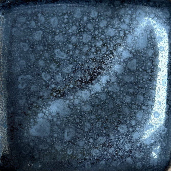 The 674T Floating Blue is a high gloss glaze that is a deep blue with beautiful floating specks where it is applied thick or where the glaze pools, and breaks a lighter blue colour on rims and edges. This glaze is foodware safe.