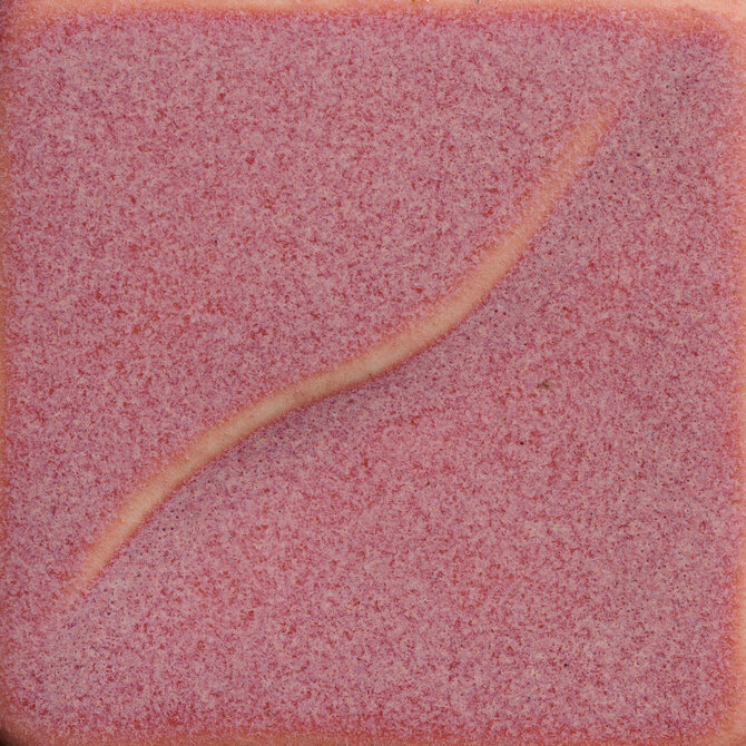 Rose quartz is a glossy, opaque, variegated pink glaze that breaks over texture. Pastel pink micro-crystallization may develop on vertical surfaces.